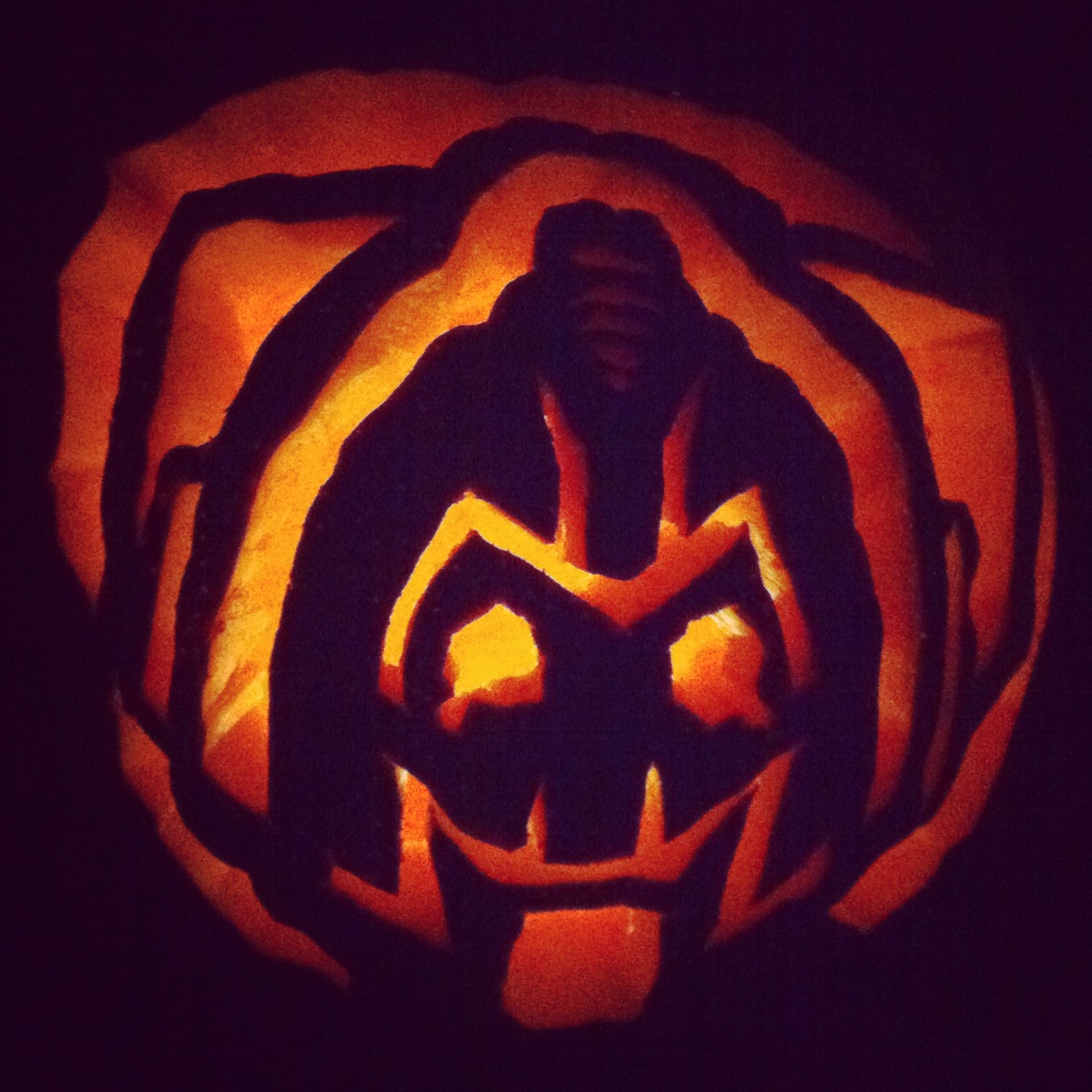 Ah yes, now the festive spirit of the holidays is decking my halls – and windows. Once the tip of my middle finger regains some feeling (having gone numb from pressing my knife through layers of paper), I’ll have at it again and make a few more snowflakes. Might design some Doctor Who related ones. Speaking of which, since I apparently never posted a picture of my jack o’lantern circa 2011, here it is: