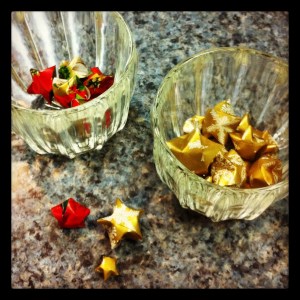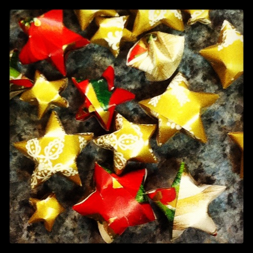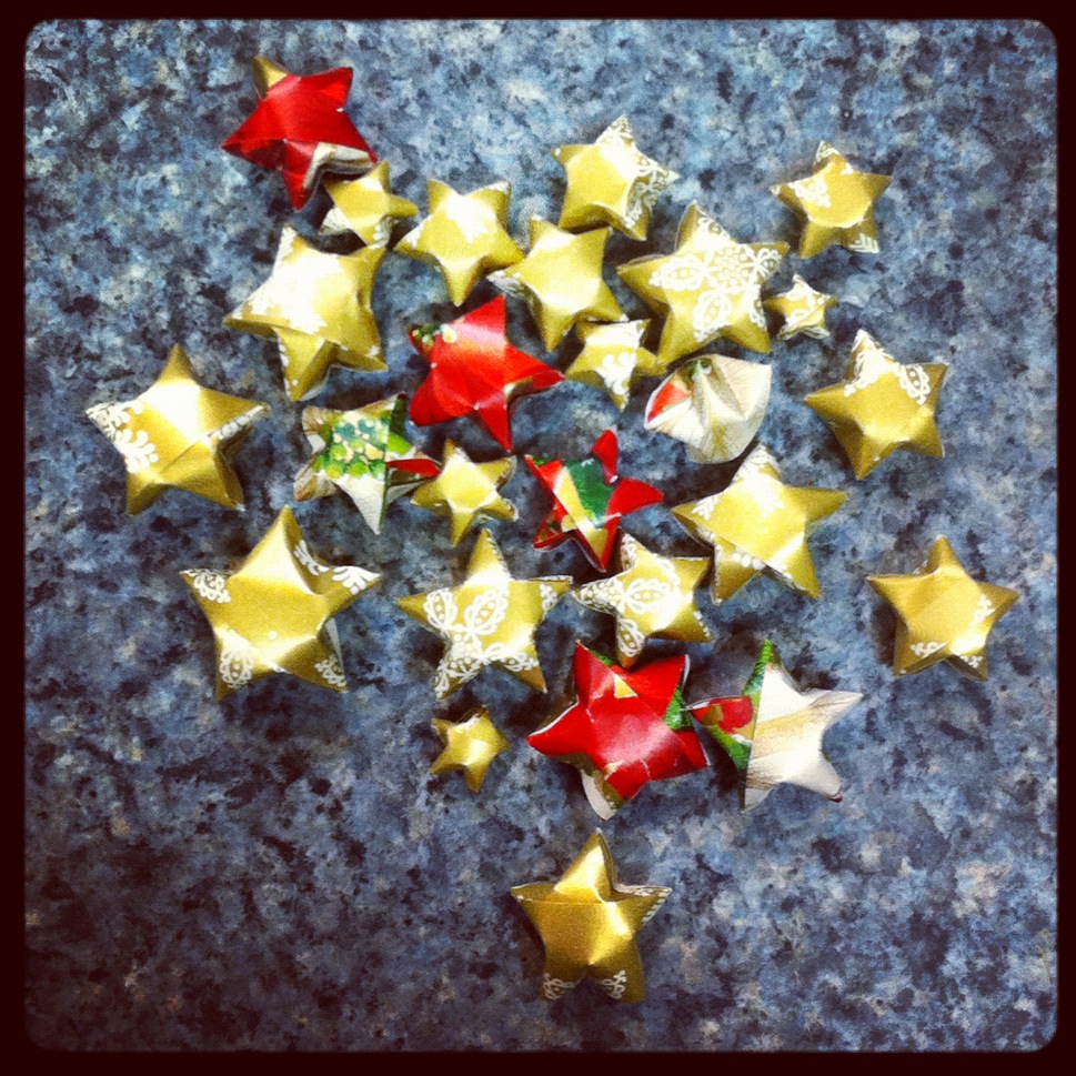 This morning at work I unwrapped some items that I had carefully wrapped a few weeks ago for a Christmas promotion. It occurred to me that the used wrapping paper would be useful for craft projects, and then I remembered a post I had seen on The Mary Sue that dealt with this very issue. There I found the very same fun little Origami Lucky Stars that I had seen on The Cheese Thief blog recently. I had been meaning to make some. Turns out, they are super easy to make and quite addictive. I made a pile of them, ingrained the instructions into my memory, and can predict that these Lucky Stars will travel with me into the future!