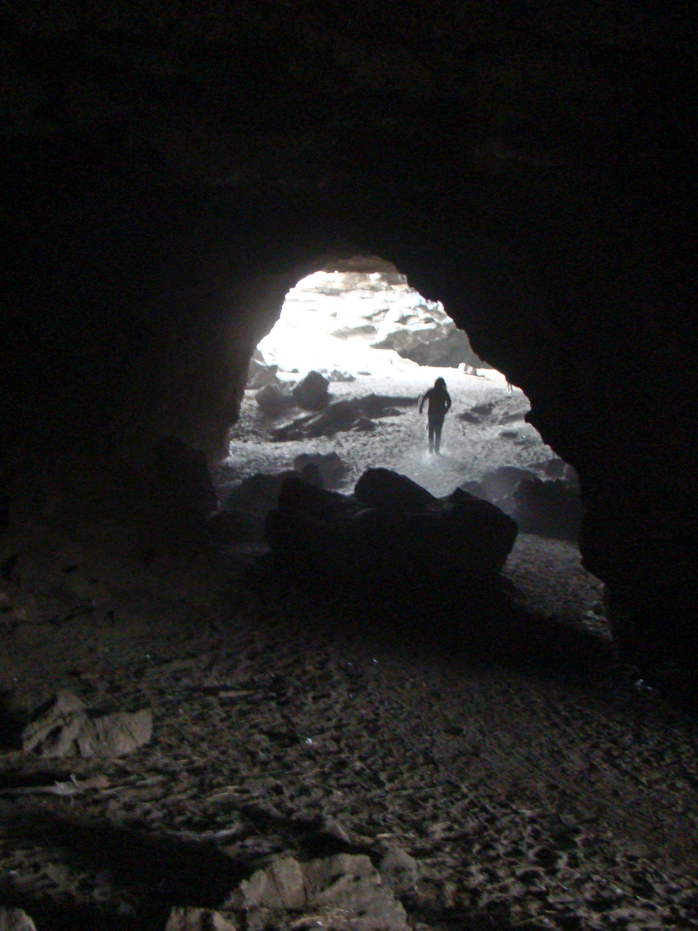 With a friend I found my way to a cave last Friday and was totally blown away by the bizarreness of these underground tunnels formed by molten lava (as the surface of the lava flows cooled the hot stuff on the inside kept flowing until eventually the tubes drained out and long, narrow tunnels were left behind.) There are over 300 such caves in Deschutes Nat’l Forest, and more riddle private lands. The one I visited was near Big Sky Dog Park and was hard to find. Even the entrance surprised me – it was more or less a huge hole in the ground, and if we hadn’t been searching high and low for it, we’d have surely missed it.