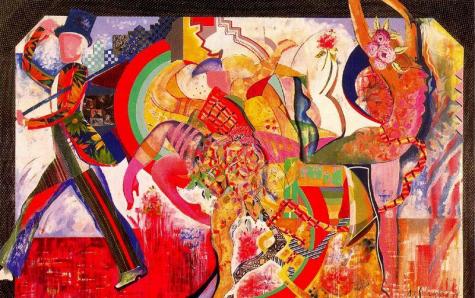 A Google search for ‘free fall’ imagery led me down one of those odd internet wormholes, and I found Miriam Schapiro’s Free Fall (which appears above) and then the artist herself. I am so glad! She is a very interesting lady, and her artwork is gorgeous. I love her use of color, the inclusion of fabric in her work, and the way she ‘collaborates‘ with other artists (like Mary Cassatt and Frida Kahlo). I am looking forward to learning more about her. Here’s another one of her ‘femmage’ pieces: