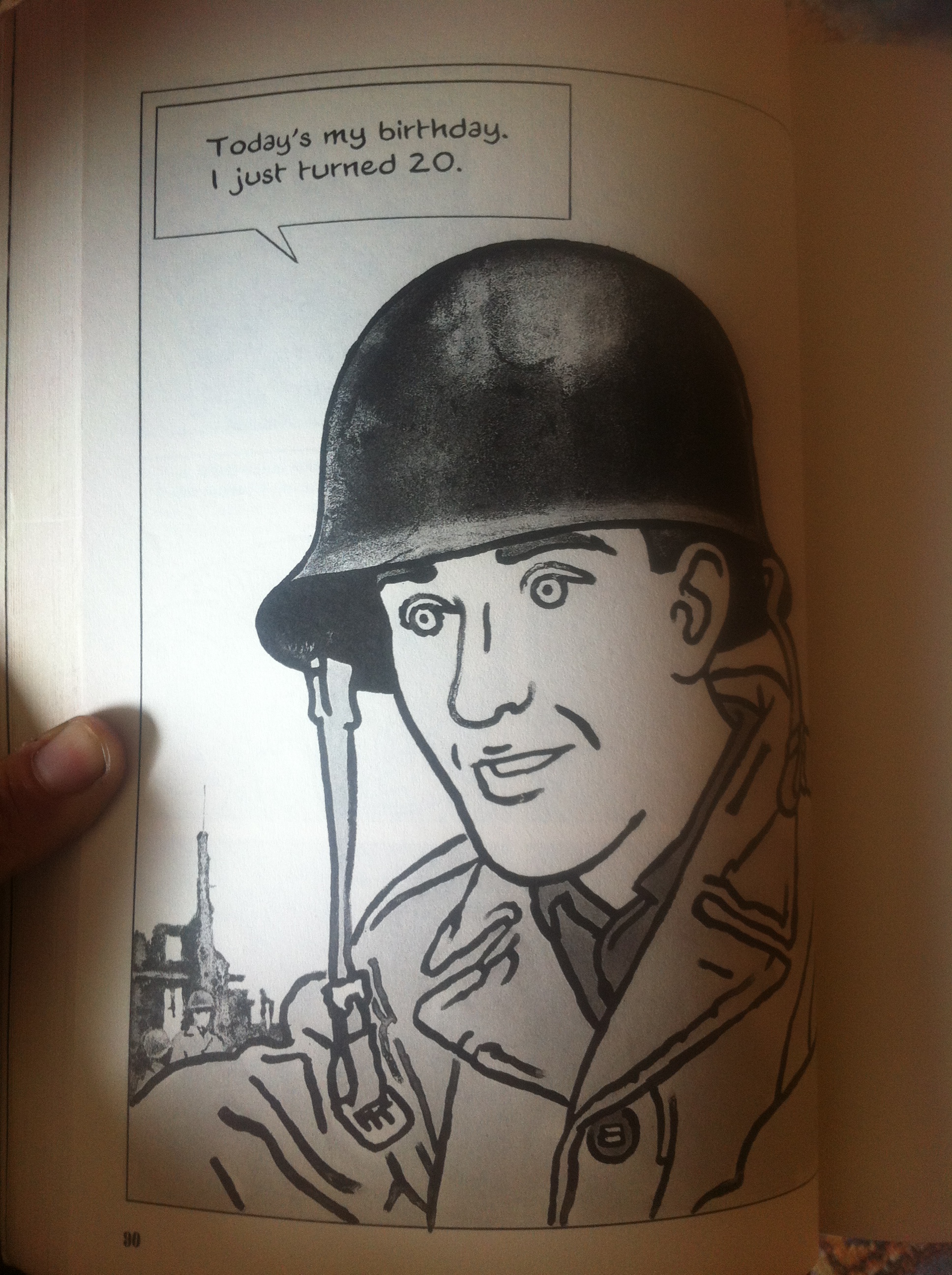 Of course I found other ways to hear the people speak. I picked up Emmanuel Guibert’s Alan’s War: The Memories of G.I. Alan Cope, which tells Alan’s story in comic book format. Guibert (who produced the excellent graphic memoir The Photographer) met Alan Cope when he was an old man living in France, became good friends with him, and soon found himself setting down in images the stories that Cope told him. Alan’s War is a much quieter book than The Photographer, but it is compelling in its own way. Cope’s wartime adventures seem pretty mellow – he spent much of his time in Eastern Europe (as part of General Patton’s 3rd Army) just driving round the countryside, and only injured himself doing things like falling out of the second story of a barn. He didn’t see much combat, although there was no avoiding some of the horrible and pointless results and aftermaths of battle. He became a soldier as a very young man, and while WWII raged in the background Alan was more focused on personal development and discovery, and on the friends he made. He delighted in coming across musicians and getting them to play, the physical satisfaction of hiking, good meals with local families he encountered, being one of only two guys who didn’t get seasick during the ocean crossing… As can be expected, the war had a lasting effect on Alan’s life, influencing his work afterward, where he lived (he only returned to America for a short time), and his relationships. His storytelling was straightforward, a little bit funny, occasionally eloquent and even philosophically lofty at times. He definitely came across as a fellow I would have liked to chat with, and I thank Guibert for, in a way, making that possible. Guibert’s perfect illustrations and Alan’s simple voice make for a book that catches you off guard – with it’s matter-of-fact style, it takes awhile to build up an emotional punch. It’s understated yet all the more powerful because of that. The day Alan arrived in France and saw the city of Le Havre, utterly destroyed, he had this sudden startling realization: