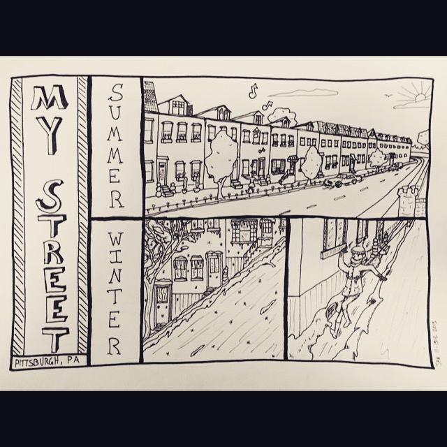Today I finally sat down and did something I’ve been meaning to do, as a practice-for-Sally-Bone exercise. I love Pittsburgher Chancelor Humphrey’s street style photography, and was pleasantly surprised when he took a picture of me downtown last October. I redrew it as a Sally Bone piece (observe, at the top of this post) and I have been meaning to go on drawing skeletonized versions of his pictures. His website (#KeepPittsburghDope) is full of fun material to draw.