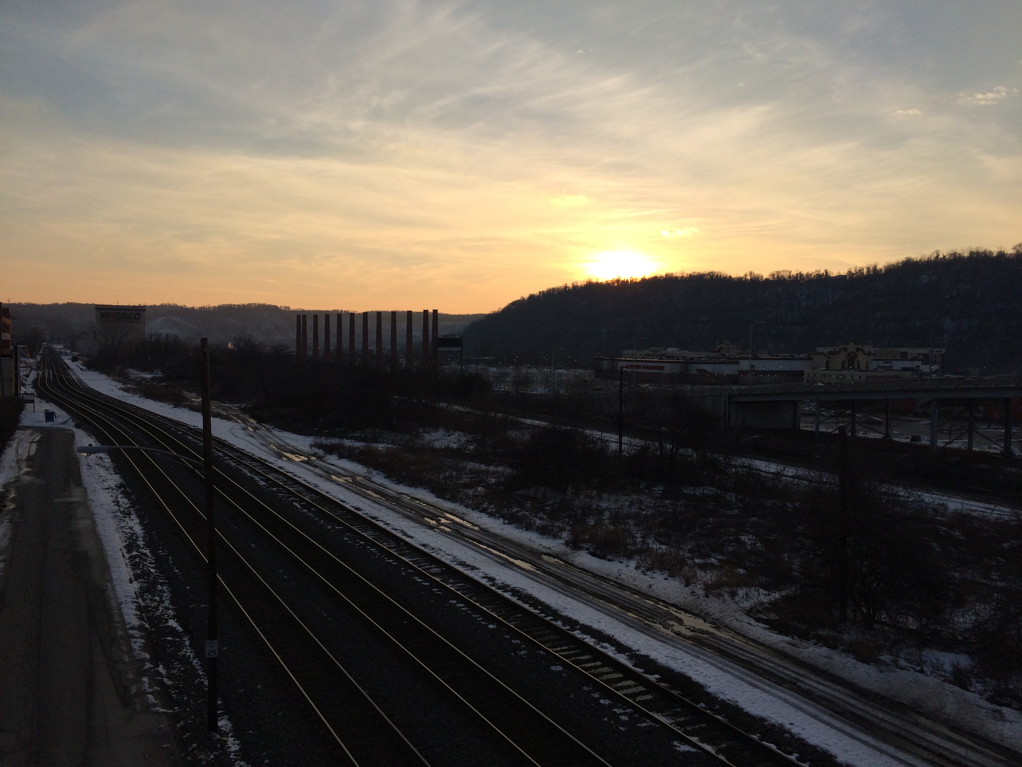 I left school today at 5:30 and it was bright out and above freezing, so I sat in the nearby park in a patchily sunny bench, surrounded by fragments of snow, and for a few moments just…basked. Then, energetic from even those few drops of sunlight, I walked through Homestead and over the Homestead Grays Bridge to catch sight of the sun setting over the Monongahela River.