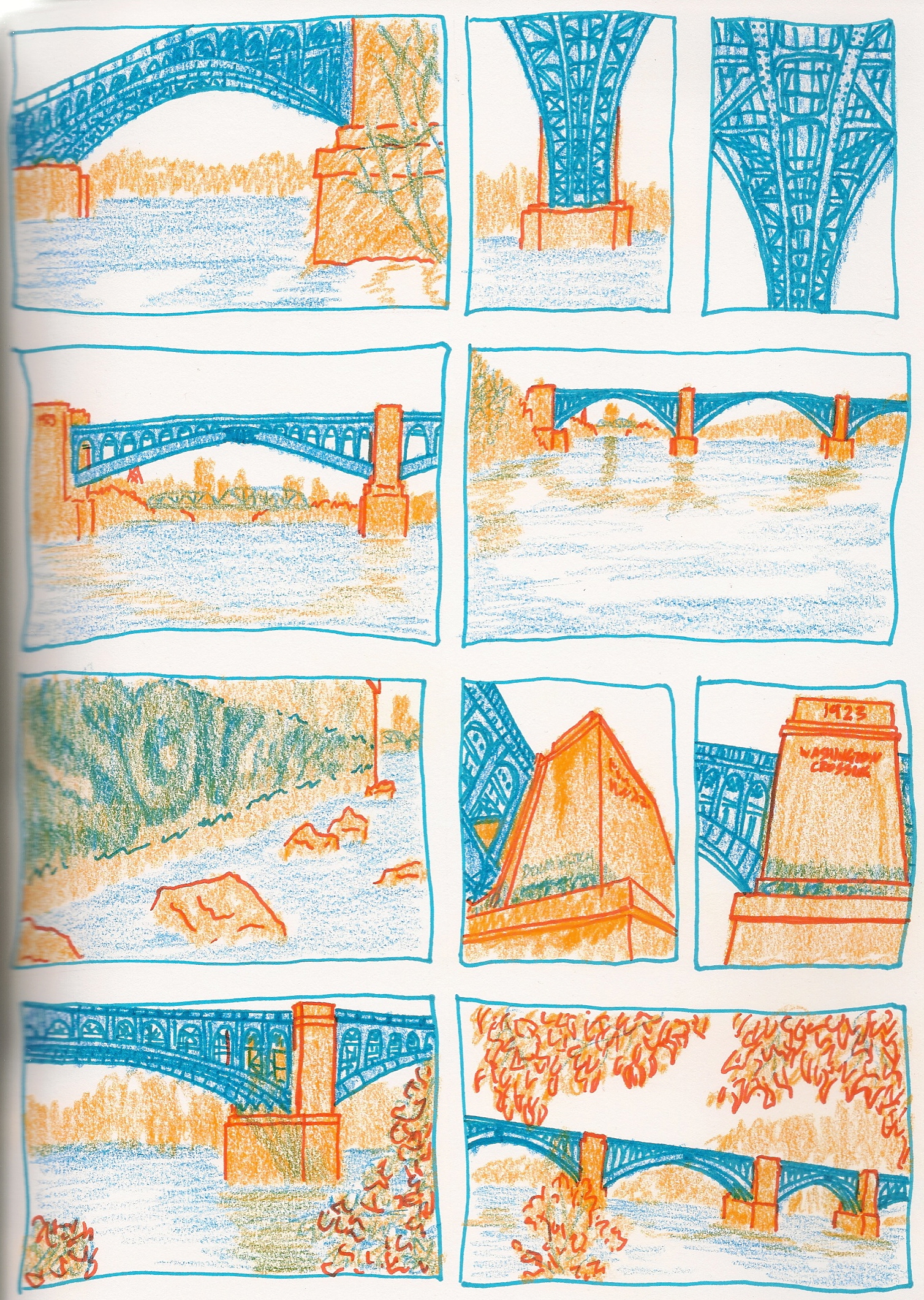 Directly after tumbling out of bed and inhaling some cereal, I set to work, unleashing a collection of experiments for myself. Inspired by the Comics Salon exercise, I chose to scribble shapes and then go back with lines (using my own photographs as reference.)